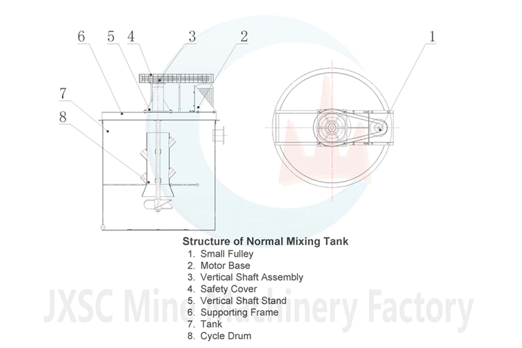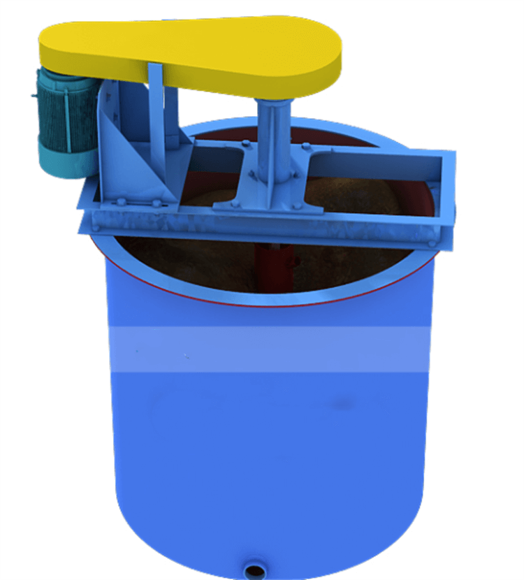 The motor drives the V-belt to drive the impeller to rotate, mix the medicine and pulp evenly to increase the reaction time and enhance the quality of the medicine reaction. Agitating tank is suitable for mineral processing and can also mix various kinds of the chemical industry. The mixing tank is suitable for all kinds of metal ores, mainly used for mixing before flotation. It can fully mix the reagent and pulp and can also be used for mixing other non-metallic minerals. It is used in the case that fixed component concentration is less than 30% (by weight) and the particle size is less than 1 mm. Its form is flat-bottomed barrel-shaped radiation circulating spiral impeller mechanical stirring type. The working principle of a double impeller leach mixing tank is the slurry flows from top to bottom in the center under the action of double impeller drag and stirring, diffuses through the surrounding damping plate, and feeds air into the lower end of the shaft to mix with the slurry and circulate upward to form a uniform suspension mixture.