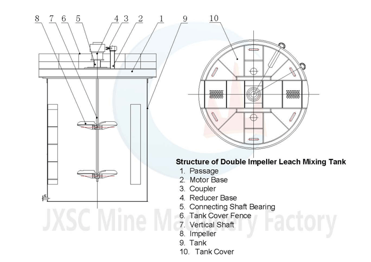 In our product line, there are common mixing tanks and double impeller leach mixing tanks. The double impeller leach mixing tank is suitable for gold leaching, adsorption, and other mixing operations with small proportion, low viscosity, slow settling speed, ore size of more than 90% of -200 mesh, and pulp concentration less than 45%. It’s with a double impeller that can mix evenly, the impeller is covered with glue and has a long service life, the multi-point air supply is adopted to ensure even inflation. And also, it has the feature of low energy consumption and high efficiency.