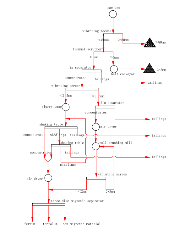 Hopper->Vibrating Feeder->Trommel Scrubber->Jig Separator->(roll crushing mill->)Vibration Screen->Slurry Pump->Shaking Table->Air Dryer->three disc magnetic separator