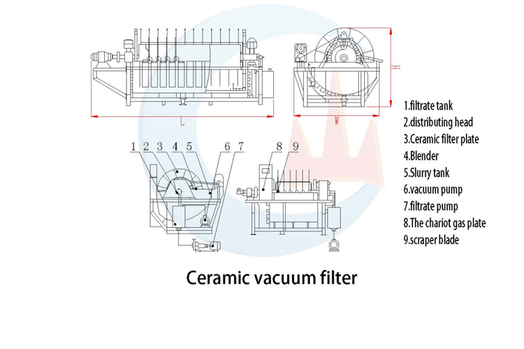The ceramic vacuum filter consists of filtrate tank, distributing head, ceramic filter plate, blender, slurry tank, vacuum pump, fitrate pump, the chariot gas plate, scraperblade, etc.
