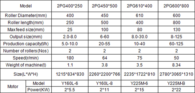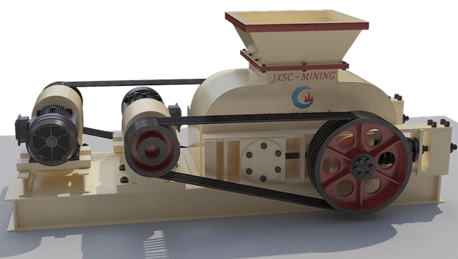 Double roll crusher is mainly composed of 2 rollers, driving, pressing & adjusting devices and roller support bearings. One roller is fixed and the other is adjustable. The gaps between the two rollers decide the discharge particle size. The minimum discharge particle size can reach 0-1 mm or 0-2 mm.
