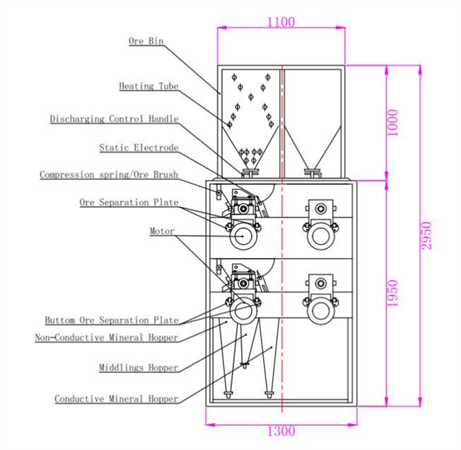 It adopts a double-row four-layer structure. Each layer has a grounding arc-shaped slide plate what is made of rust-free steel. An arc-shaped high-voltage electrostatic plate what is made of aluminum plate is installed on the upper part. The electrostatic plate is fixed but it can be adjustable. After the high-voltage static electricity is applied, the mineral slips through the lower mine board to the grounding arc board and then enters the high-voltage electric field area. The conductive mineral is induced to be charged and attracted to the electrode. Due to the gravity, its trajectory is different from that of the non-conductor mine. When discharged, the non-conductor ore is also affected by the electric field. But the non-conductor ore will not be attracted to enter the lower layer and be sorted again. Such selection is repeated 4 time until the mineral product is qualified.