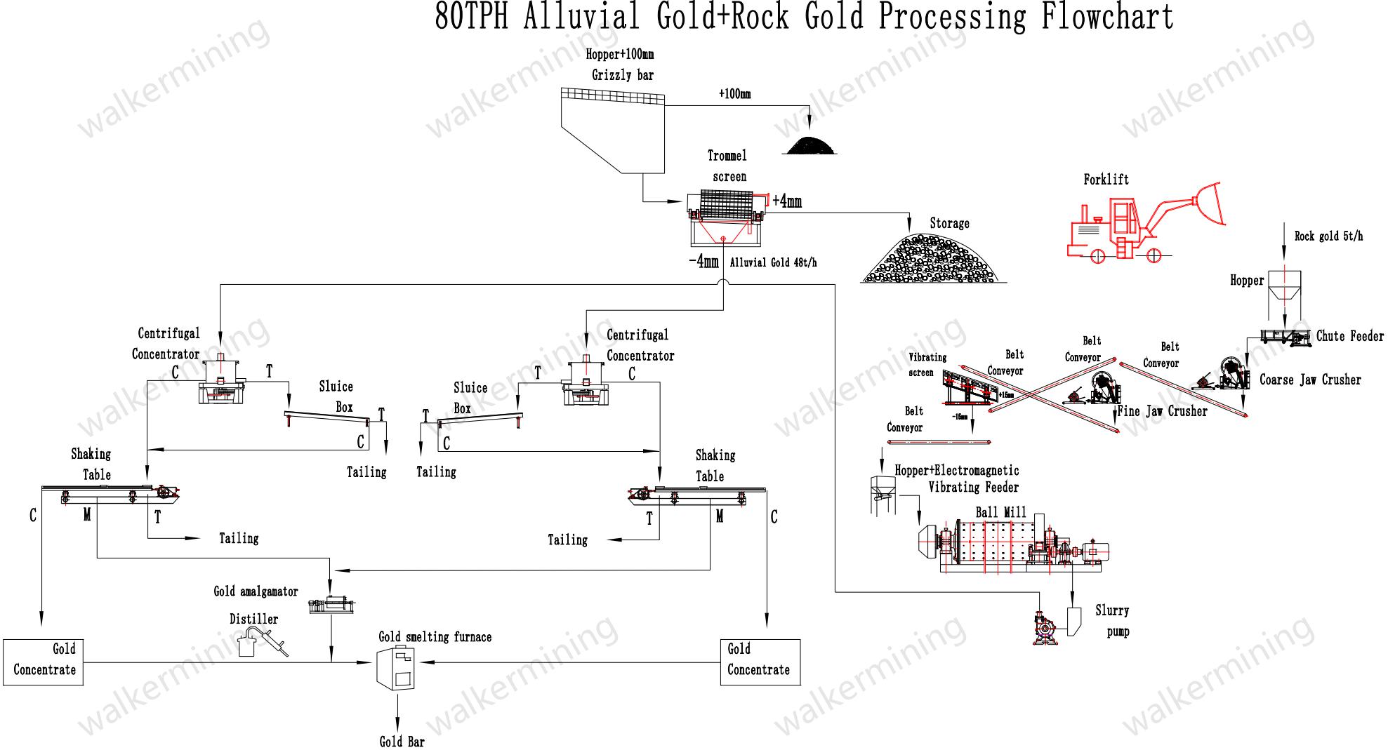 for alluvial gold and hard rock gold,the further processing methods(after the alluvial gold is dissociative from the sand, but the rock gold is covered by others mineral.So for the alluvial gold you need only washing and then shaking you will get pure gold; But for hard rock, you need to use some chemical to extract the gold(by cyanidation),it is much more complex and higher cost .Most of the customers will start the alluvlal gold mining first and with their experience grows, then they add the hard rock mining again. Below is the flowsheet for alluvial,Hard rock,Elluvial gold processing plant .