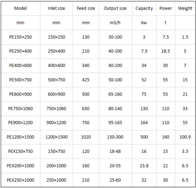 With a symmetrical "V"-shaped cavity design, the toggle plate has a large inclination angle and a large stroke. Compared with the traditional PE series jaw crusher, the feed size is larger, the output is higher, the particle size is more uniform, and the jaw plate wear is reduced.