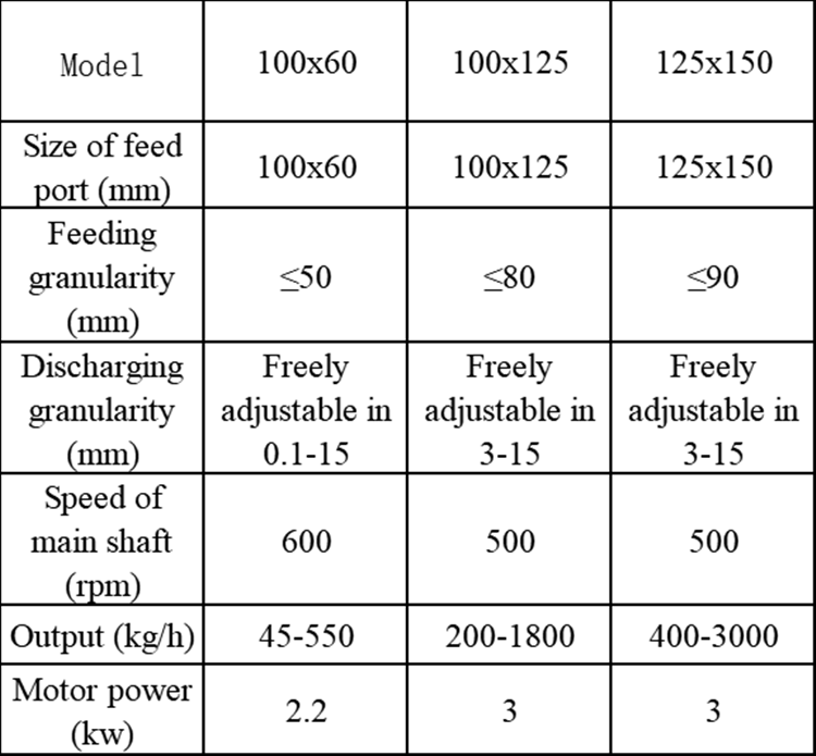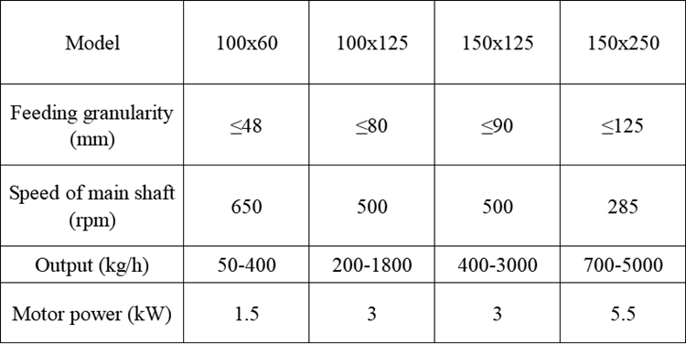 | Model | Max. FeedSize (mm) | Discharge Opening size (mm) | Capacity (kg/hr) | Motor Power (kW) | Weight (kg) |
