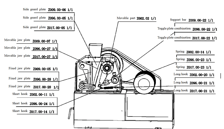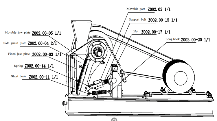 The laboratory jaw crusher body is welded by 12-16mm iron plates. Its front wall is mounted with jaw plates and its rear wall with springs and locknuts and both sides are installed with liner plates and above the side plates, two sliding bearings are installed to support the eccentric shaft. The eccentric shaft is supported inside the hole of sliding bearing and its lower part is connected with the adjusting mechanism via the toggle plate.
