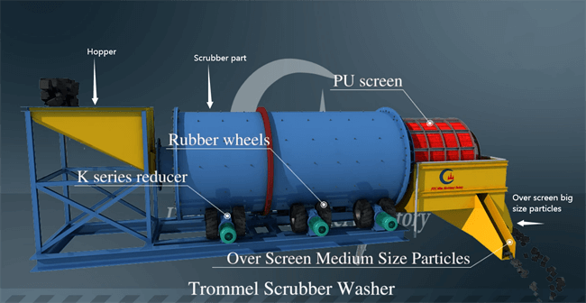 Trommel scrubber is also known as trommel washing machine, trommel concentrator. It is used to clean the mud-containing ore before the beneficiation process is executed, and to improve the beneficiation index of the subsequent process. It is often used for manganese ore, iron ore, limestone, tungsten ore, tin ore, and silica sand washing of ore and other minerals. The trommel washing machine is a large-scale equipment used in ferrous and non-ferrous metallurgical mines, iron and steel, metallurgy, chemicals, and building materials to wash ore and stone. It has a large processing capacity to meet the high productivity and the cleanliness of the ore and stone. It's also an ideal equipment for businesses that require.