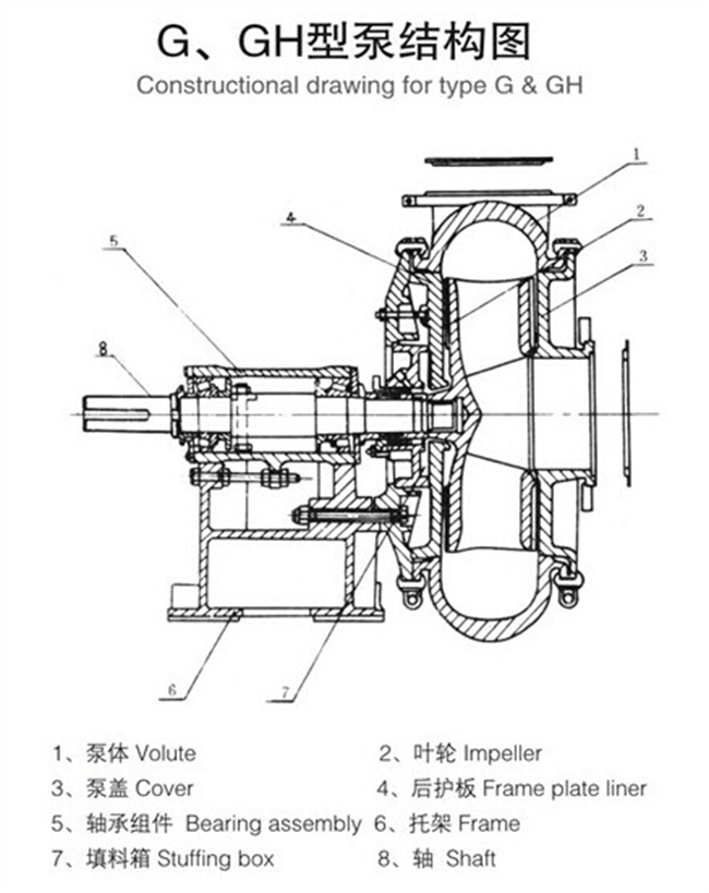 A sand & gravel pump main consists of volute, impeller, cover, frame plate liner, bearing assembly, frame, stuffing box, shaft and so on.