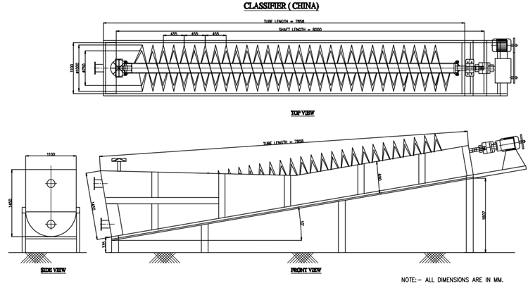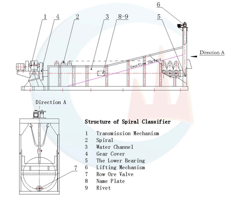 The shape of the spiral classifier is a rectangular chute with an inclination angle of 12°- 18.5°. The bottom is semicircular, and one or two longitudinal shafts are installed in the groove. The spiral blades are continuously arranged along the shaft length, and the spiral shaft is driven to rotate by the upper end transmission mechanism.