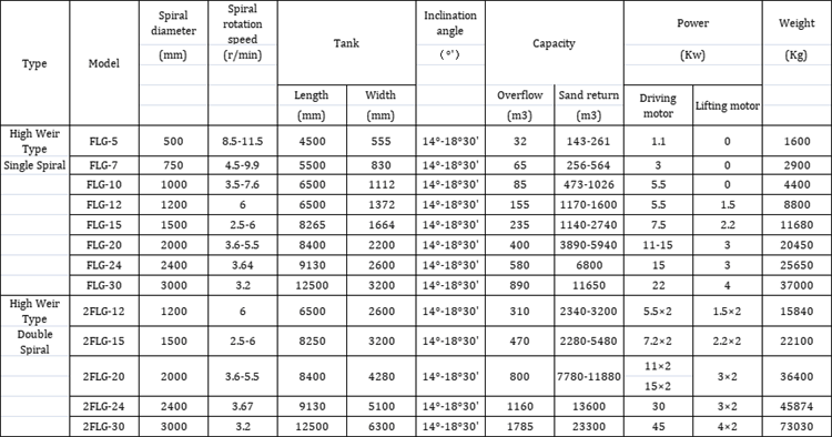Spiral classfiers is mainly used in the production flow of metal processing. According to the difference in sedimentation rate of mineral particles and mud, the particle sizes of ores with 14-325 meshes are classified. Waste mud or water for ore sand can be separated from the ores.