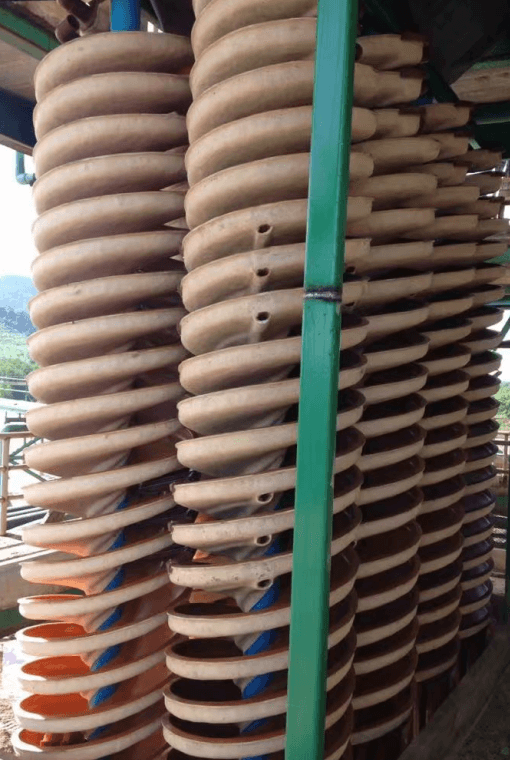 Spiral chute is mostly used to process mineral such as cassiterite, scheelite, chromite, ilmenite, Zircon, Monazite, etc., It is also used to recover heavy minerals in flotation tailings. It is generally used as a roughing equipment in mining. It can discard most of the tailings to obtain coarse concentrate.