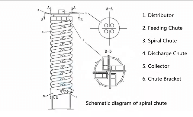Our spiral chute is composed of 6 parts: distributor, feeding chute, spiral chute, discharge chute, collector and chute bracket. The spiral chute composed of spiral pieces is the main component. The spiral piece is made of glass fiber reinforced plastic and connected together by bolts.