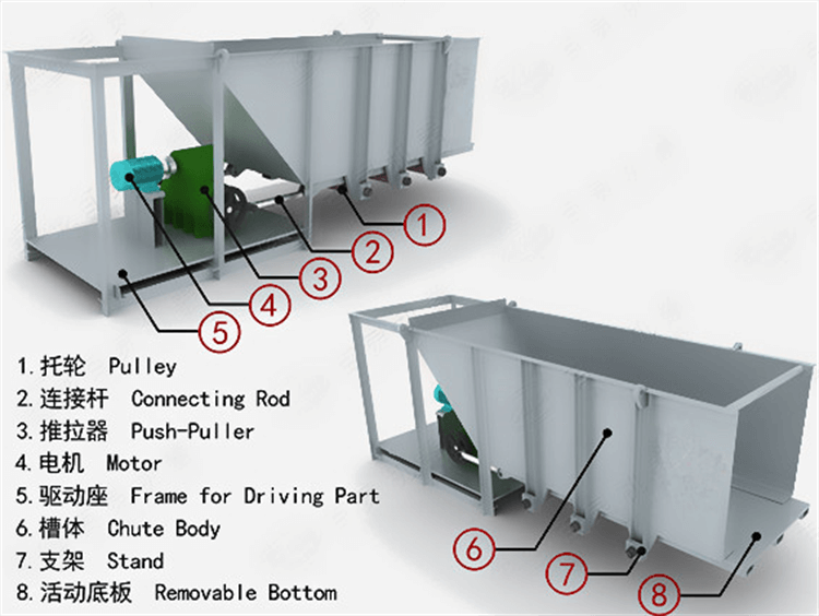 Trough feeder mainly has these parts: pulley, connecting rod, push-puller, motor, frame for driving part, chute body, stand, removable bottom and so on.