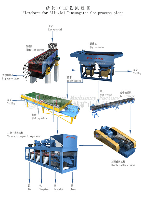 In production practice, the plant process of tungsten ore mainly includes five stages: roughing, grinding, gravity separation, concentration and fine mud treatment.