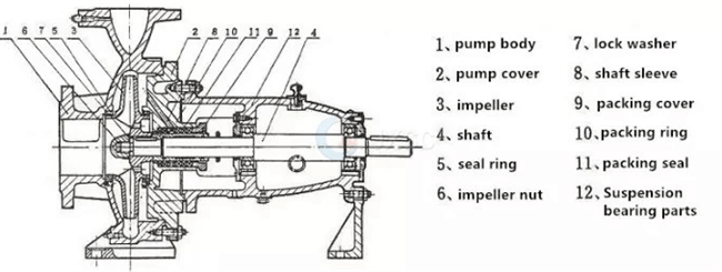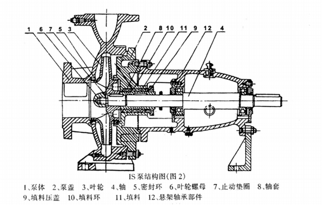 IS type water pump is mainly composed of pump body (1), pump cover (2), impeller (3), shaft (4), sealing ring (5), shaft sleeve (8) and suspension bearing parts (12).