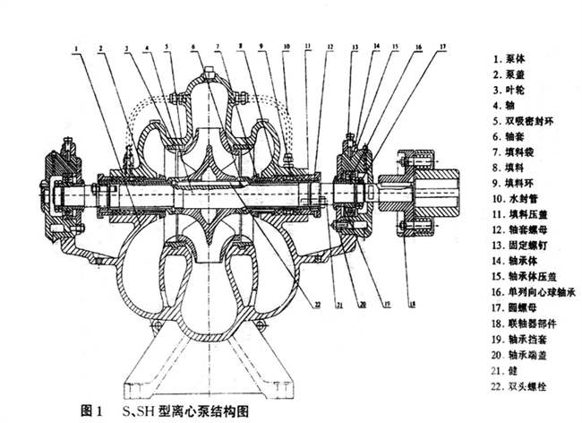The main parts of S/SH type pump are: pump body (1), pump cover (2), impeller (3), shaft (4), double suction sealing ring (5), shaft sleeve (6) and bearing body (14).